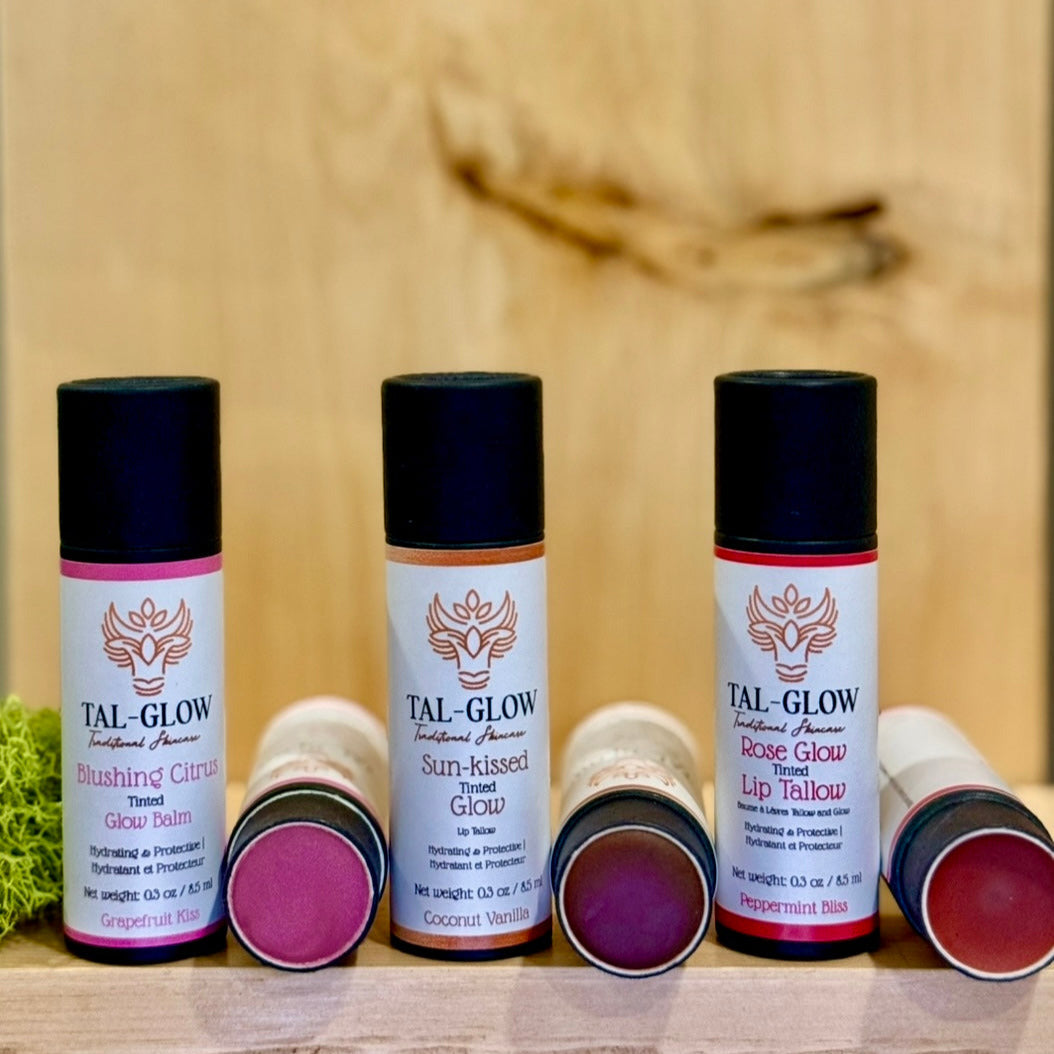 Blushing Citrus Glow: Local Grass Fed Beef Tallow, Jojoba Oil, Castor Oil, Beeswax, Pink Iron Oxide, Natural Mica & Grapefruit Essential Oil